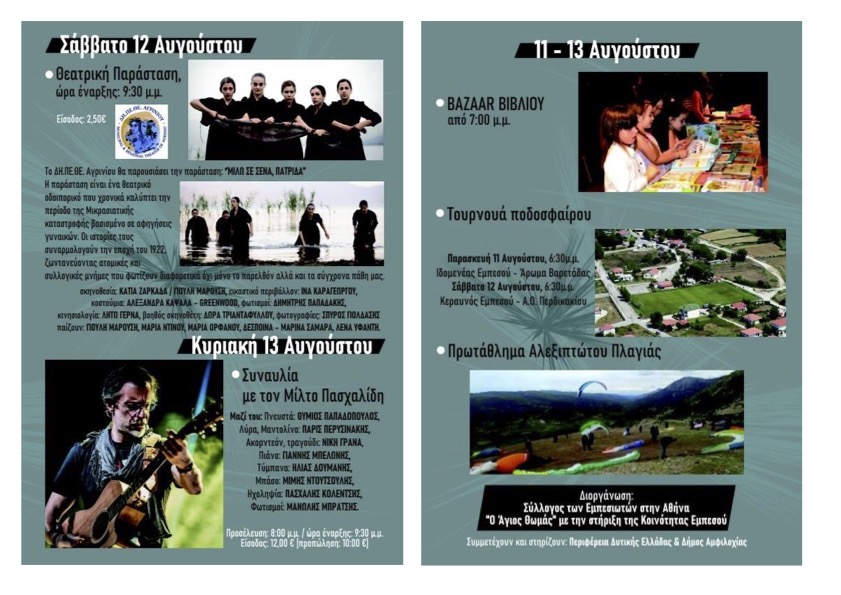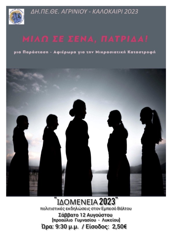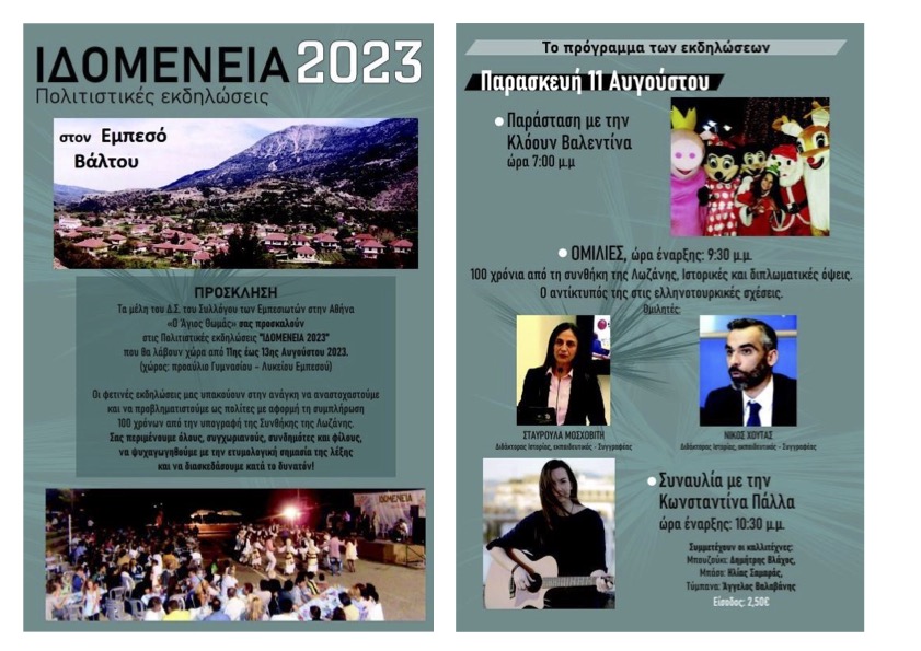 Πιέζοντας εδώ μπορείτε να δείτε το πρόγραμμα & την αφίσα των πολιτιστικών μας εκδηλώσεων ΙΔΟΜΕΝΕΙΑ 2023 και τις αφίσες [θεάτρου & καλλιτεχνών].