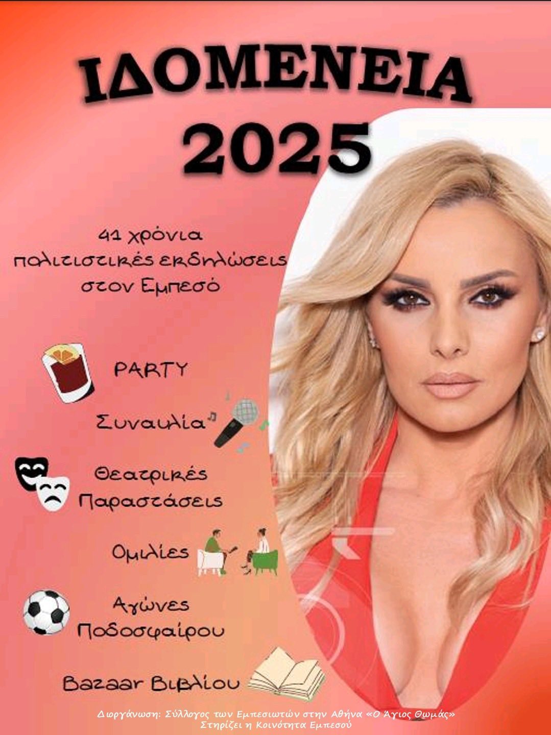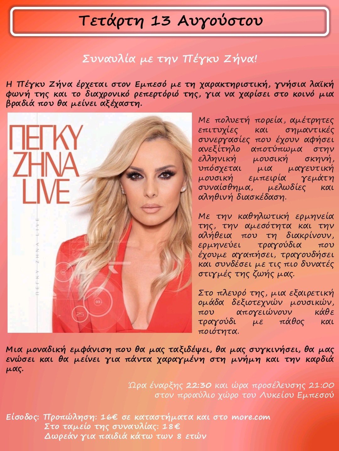 Η Πέγκυ Ζήνα έρχεται στον Εμπεσό στις 13 Αυγούστου στα πλαίσια των εκδηλώσεων για τα Ιδομένεια 2025, με τη χαρακτηριστική, γνήσια λαϊκή φωνή της και το διαχρονικό ρεπερτόριό της.