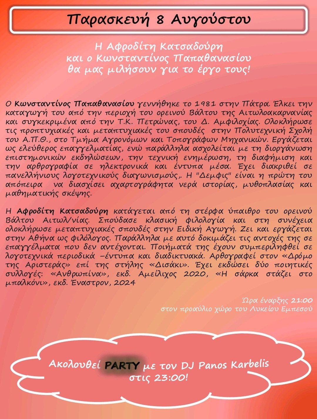 Με πολύ χαρά σας παρουσιάζουμε το φετινό πρόγραμμα των πολιτιστικών εκδηλώσεων που θα γεμίσουν το χωριό μας με γέλιο, τραγούδια, θεατρικές βραδιές, ομιλίες, αγώνες και όμορφες στιγμές για μικρούς και μεγάλους.