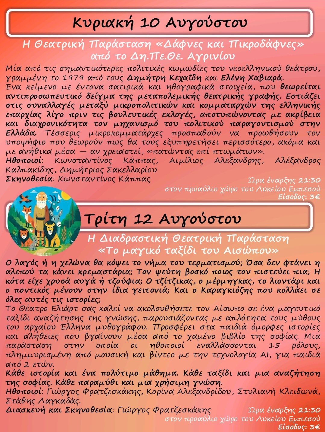 Την Τρίτη 12 Αυγούστου 2025 έρχεται η παράσταση «Το Μαγικό Ταξίδι του Αισώπου» στο χωριό μας!