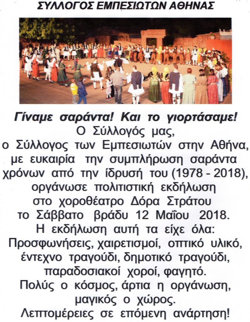Eδώ μπορείτε να δείτε τα νέα [φωτό] από τη γιορτή του Συλλόγου μας στο χοροθέατρο “ΔΟΡΑ ΣΤΡΑΤΟΥ” για τα 40 χρόνια Λειτουργίας & Δράσης (1978 – 2018).