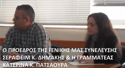 Αφού διαπιστώθηκε απαρτία, ορίστηκε ως Πρόεδρος της Γενικής Συνέλευσης το μέλος του Συλλόγου μας κ. Σεραφείμ Κ. Δημάκης και ως Γραμματέας η κ. Κατερίνα Κ. Πατσαούρα η οποία, είναι παράλληλα και η γραμματέας του Δ.Σ. του Συλλόγου.