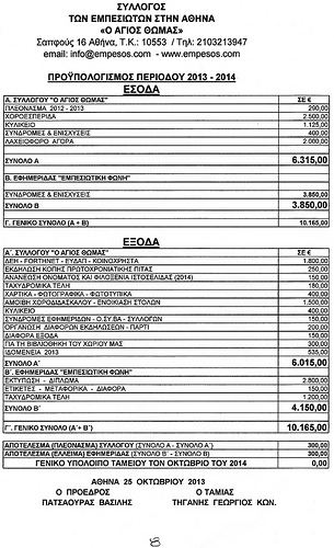 Τα μέλη της Γενικής Συνέλευσης, αφού άκουσαν και διάβασαν τα πεπραγμένα και τον απολογισμό του περασμένου έτους, τον προϋπολογισμό του επομένου έτους καθώς και την έκθεση της Εξελεγκτικής Επιτροπής, προχώρησαν στην έγκρισή τους, δια βοής.