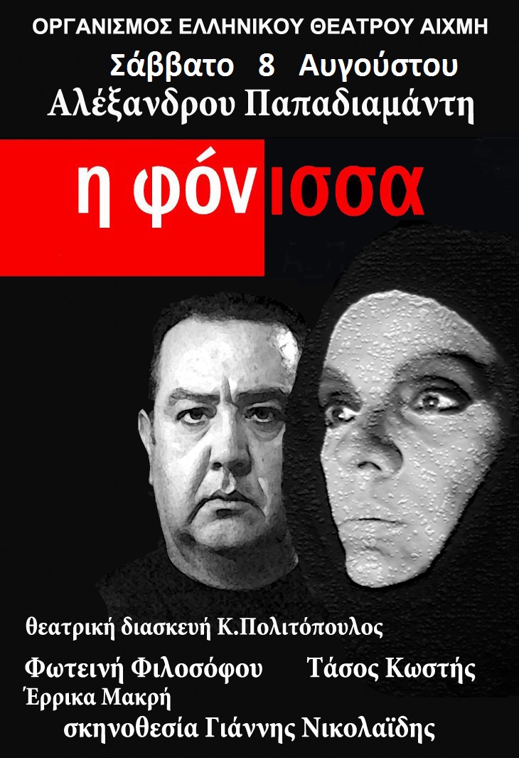 “Η Φόνισσα” του Αλέξανδρου Παπαδιαμάντη, από τον Οργανισμό Ελληνικού Θεάτρου «ΑΙΧΜΗ». Σκηνοθεσία: Γιάννης Νικολαΐδης, Θεατρική διασκευή: Κ. Πολιτόπουλος, ηθοποιοί: Φωτεινή Φιλοσόφου, Τάσος Κωστής, Έρρικα Μακρή.