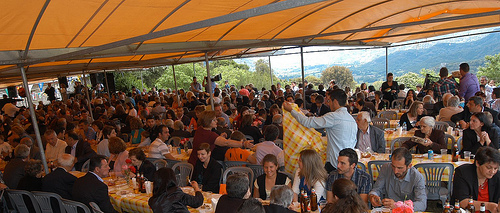Κατόπιν βρεθήκαμε κάτω από τη μεγάλη τέντα. Μια τέντα που δεν είχε τίποτα άκομψο και καθίσαμε σε κάποιο από τα τραπέζια.
